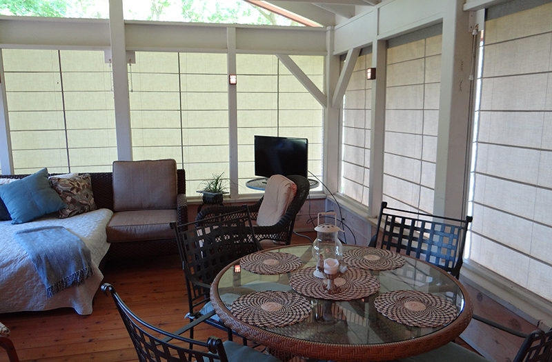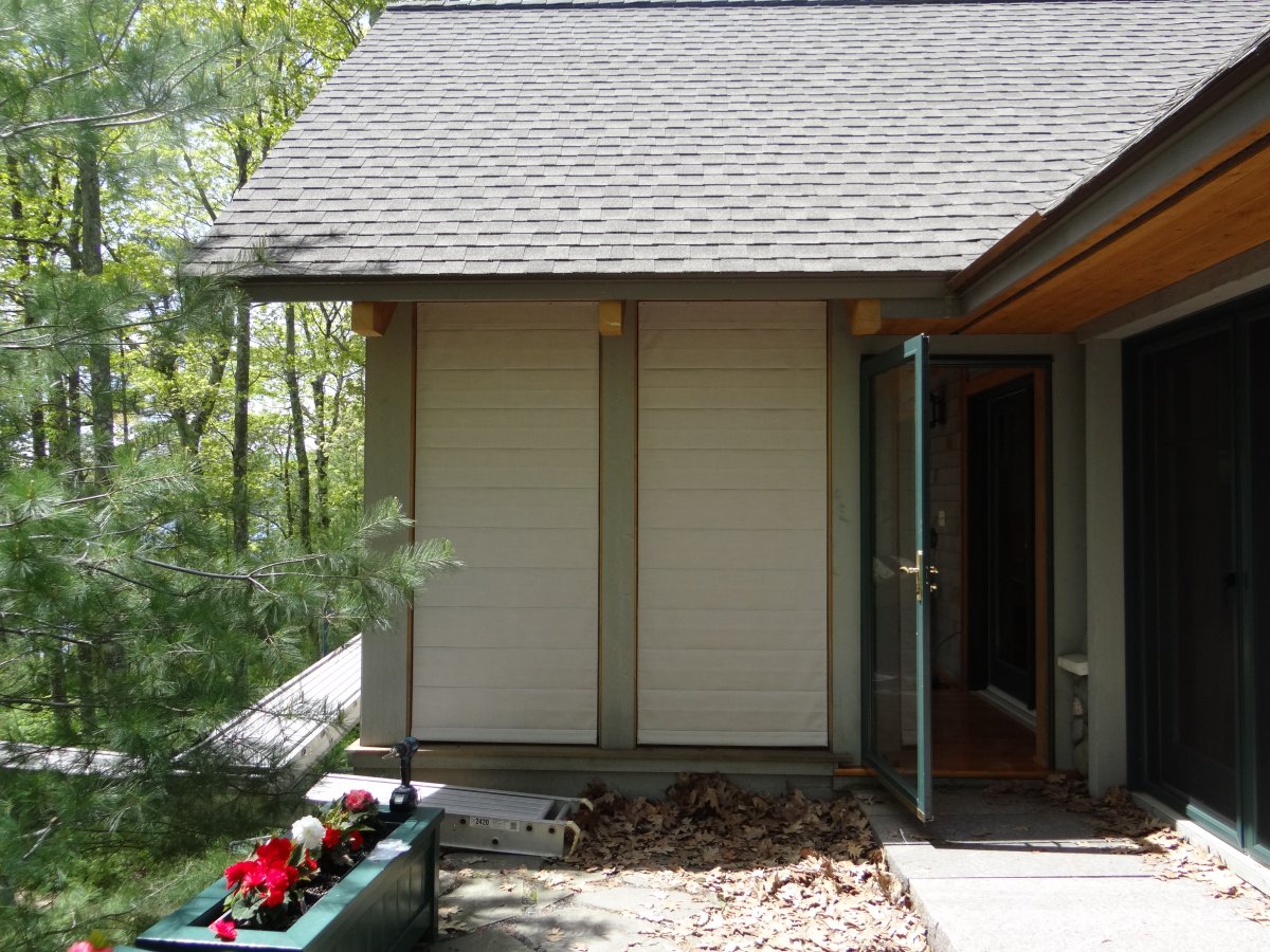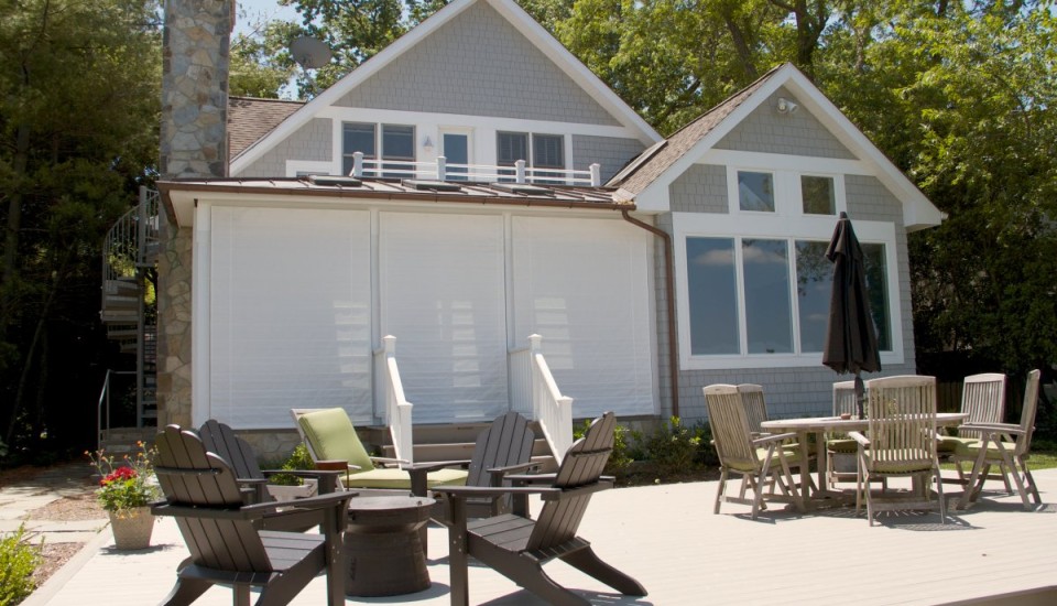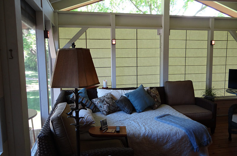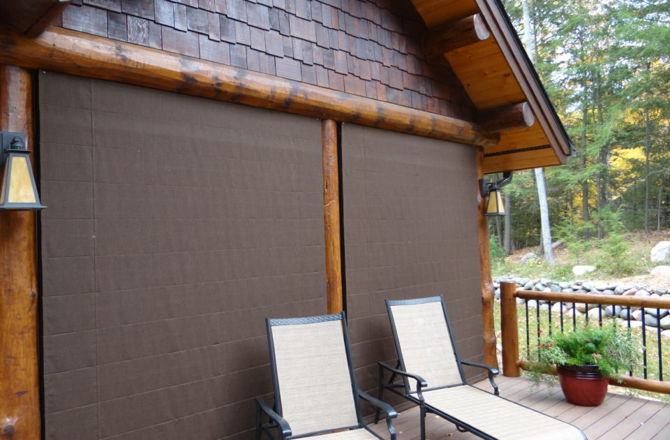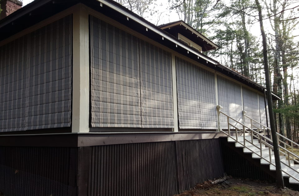 Our home owners designed their up north home to the highest standards, from the sustainable Acacia wood used in the construction to the careful craftsmanship of their home. We were honored to install our Weather Queen Shades on their cozy screen porch. Meg wanted a high quality campy look that reflected the region. She was thrilled with the couture construction of quality her Weather Queen® Exterior Screen Porch Shades
